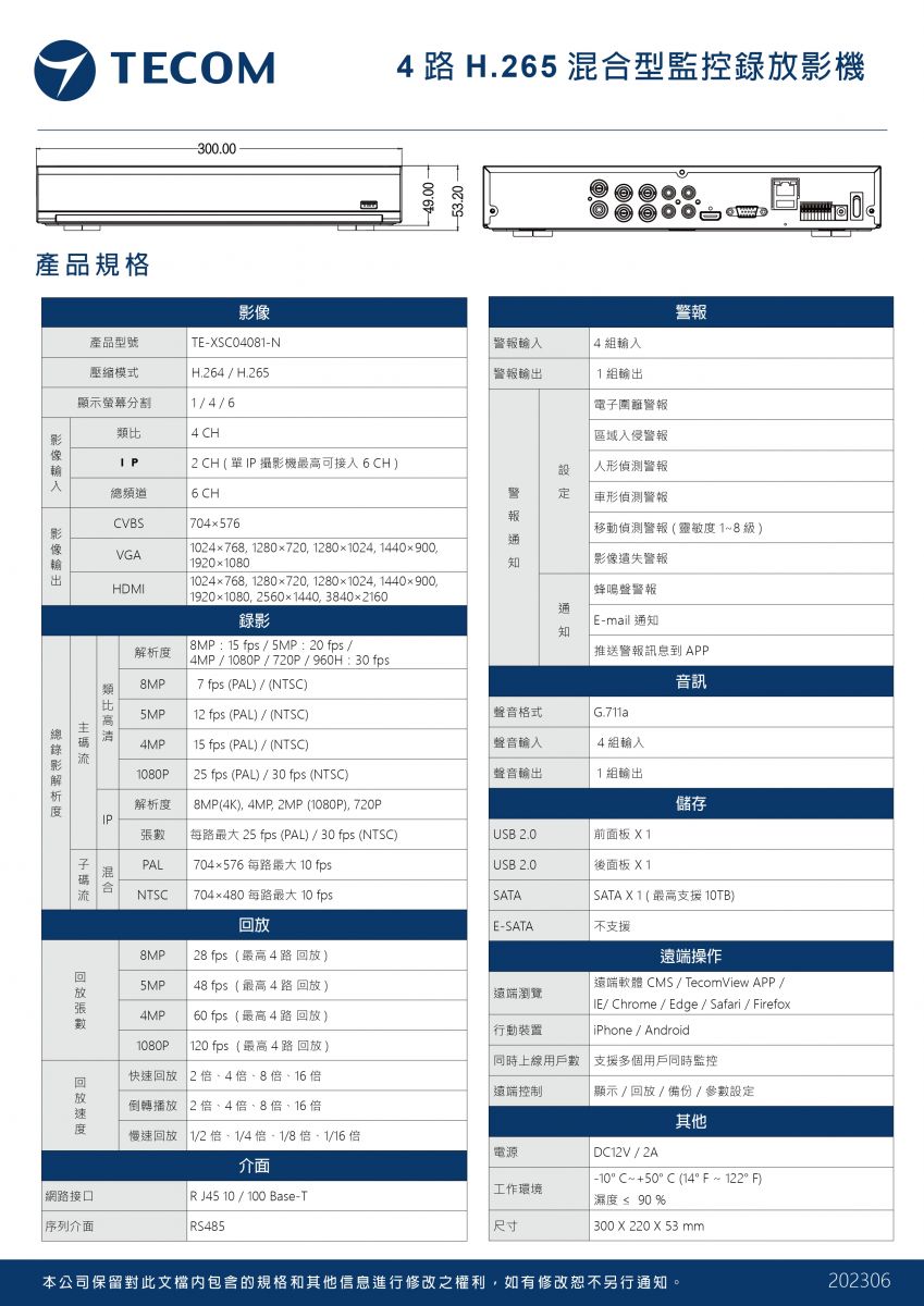 4路混合型監控錄影主機(單硬碟)-【TE-XSC04081-N】