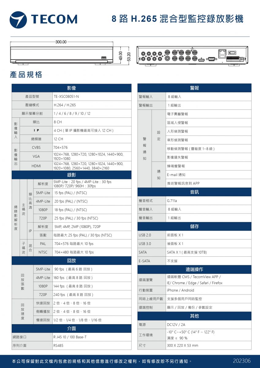 8路混合型監控錄影主機(單硬碟)-【TE-XSC08051-N】