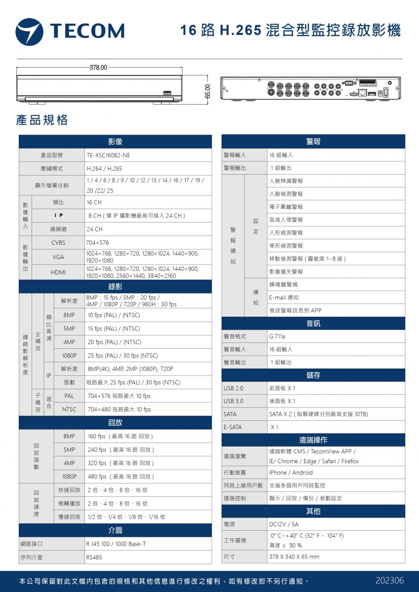 16路混合型監控錄影主機(雙硬碟)-【TE-XSC16082-NE】