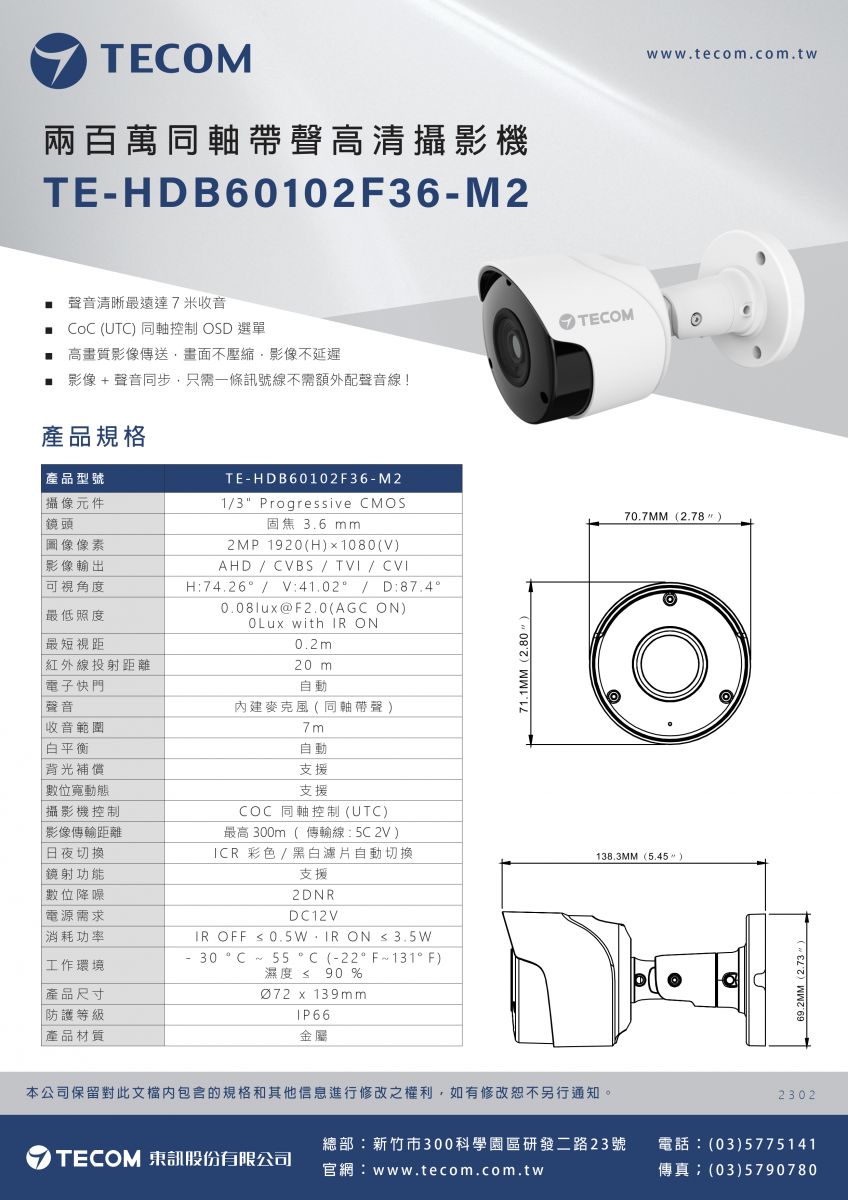 2百萬同軸帶聲音攝影機(小管)-【TE-HDB60102F36-M2】