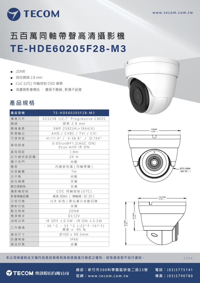 5百萬同軸帶聲音攝影機(半球)-【TE-HDE60205F28-M3】