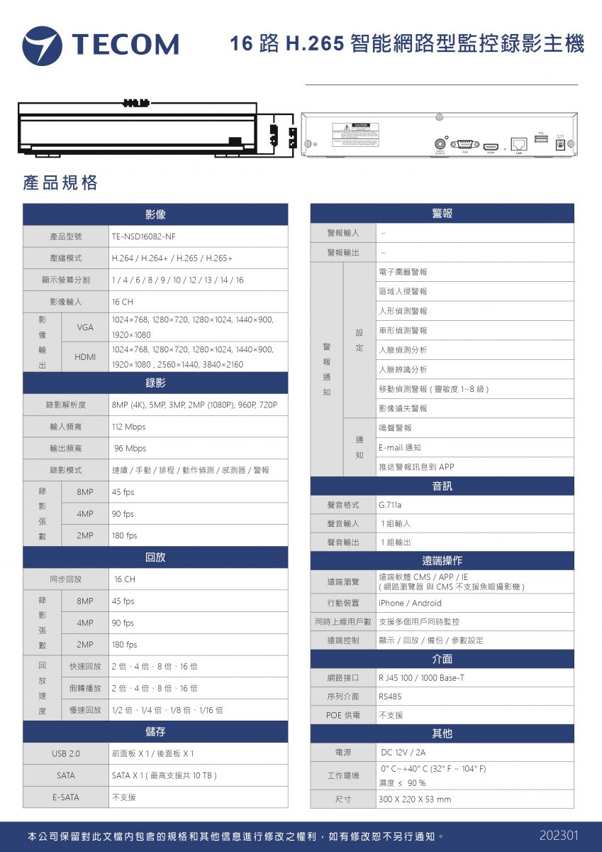 16路網路型監控錄影主機(單硬碟)【TE-NSD16082-NF】