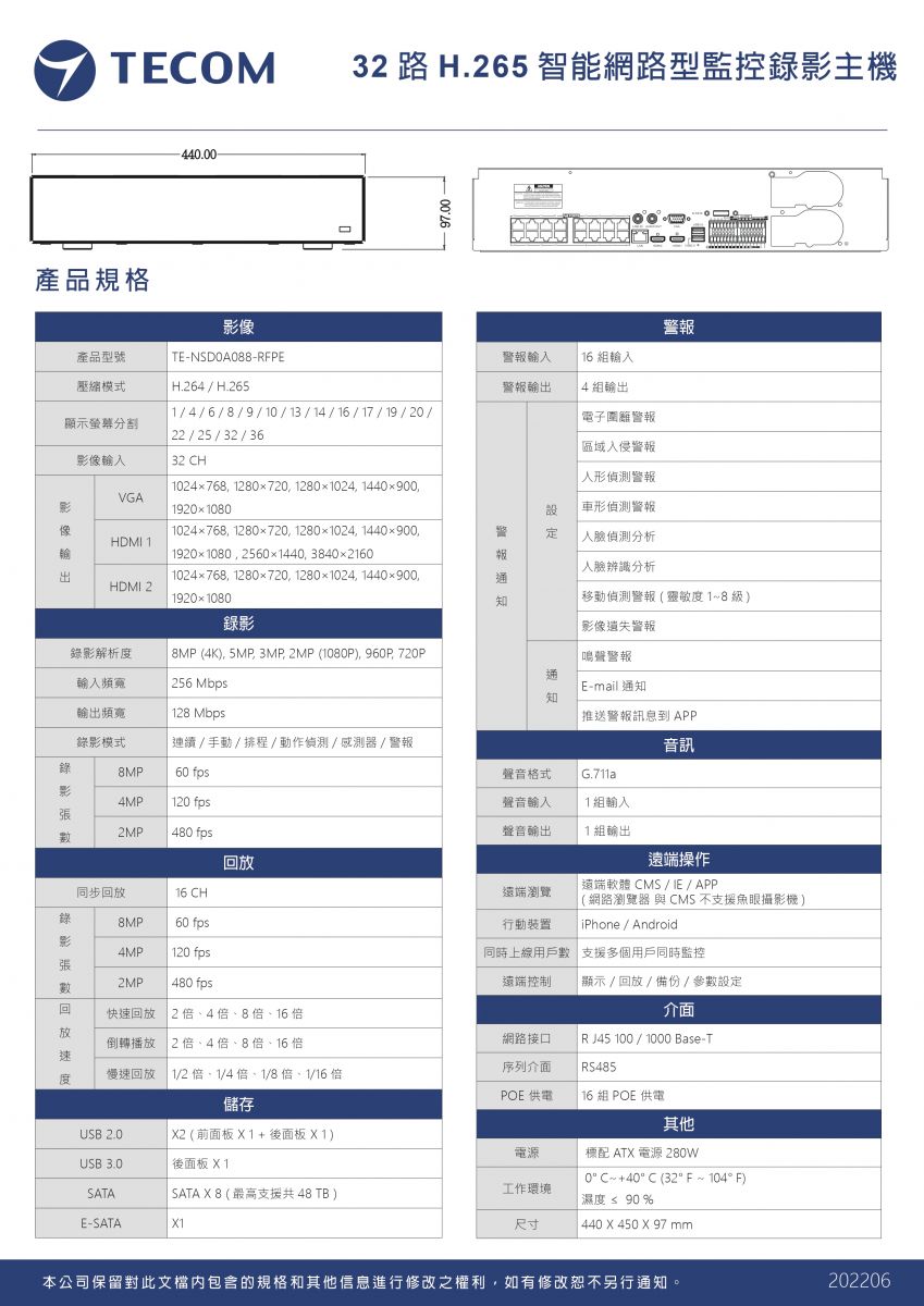 32路 H.265 網路型監控錄影主機【TE-NSD0A088-RFPE】